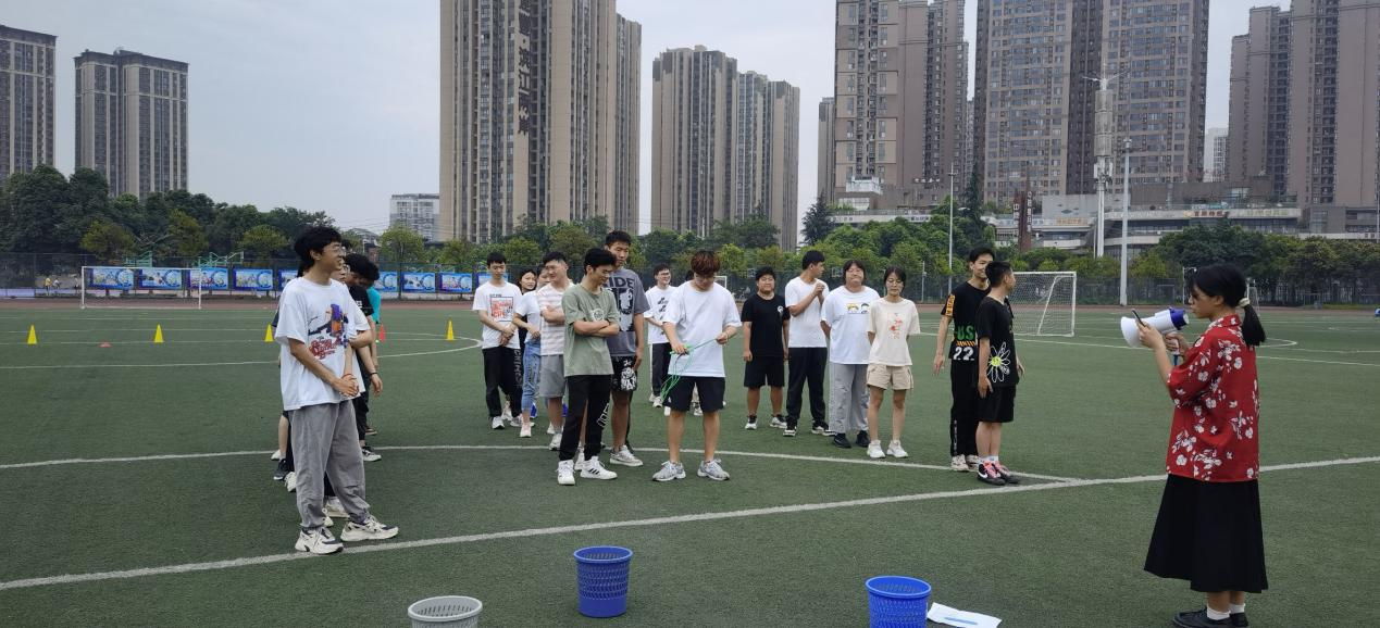 随后在任思雨、周孟雪、程莹洁的组织下进行了第一个项目——绑腿跑,每组队员将绑带绑好进行短暂练习后进行比赛,锻炼了协作能力和身体协调性。