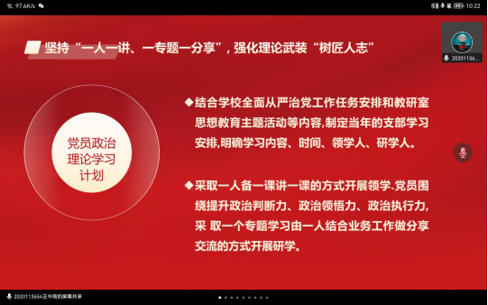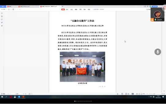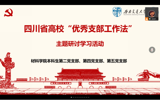 为更好发挥学生党支部和学生党员在高校人才培养、学生日常管理服务工作中的战斗堡垒作用和先锋模范作用,探索创新党建工作方法,推动学院学生党建工作再上新台阶,在材料学院党委的统一部署下,由本科生第二党支部牵头、本科生第四、第五党支部联合开展的《四川省高校“优秀支部工作法”》专题学习研讨会, 于2022年9月25日上午在线上平台举行。