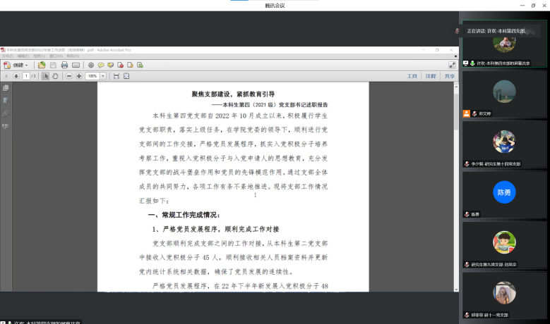 党委结合当前实际情况,在线上平台召开了第7次党支部(扩大)会议暨2022年度党支部书记述职大会。学院党委书记陈勇、党委副书记章春军、李涛副院长、王勇副院长、教师代表杨炜沂、学生代表敖东以及全体党支部书记出席本次会议。会议由陈勇主持。