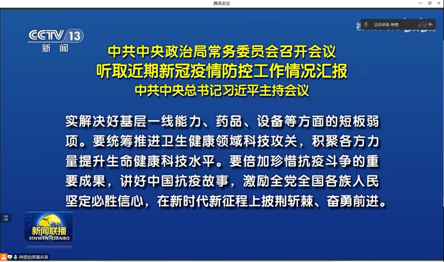 党支部书记郑纪伟同志为大家进一步解读了会议精神要点,强调要在学习中统一思想认识,提升政治站位,切实做到“两个维护”。与会同志纷纷表示要倍加珍惜抗疫斗争的重要成果,始终与党中央保持高度一致,在新的历史征程中披荆斩棘、奋勇前进。