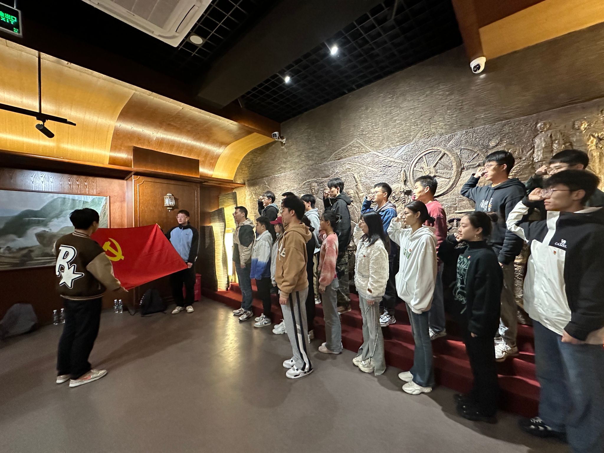 参观纪念馆后,同志们站在鲜艳的党旗下,满怀激动和敬仰,在徐励漪同志的带领下,紧握右拳重温入党誓词,重温当年的决心和信念,再次感受党的伟大和党员的责任。程识宇、何素玫等同志在纪念碑下分享了自己此行的学习心得。