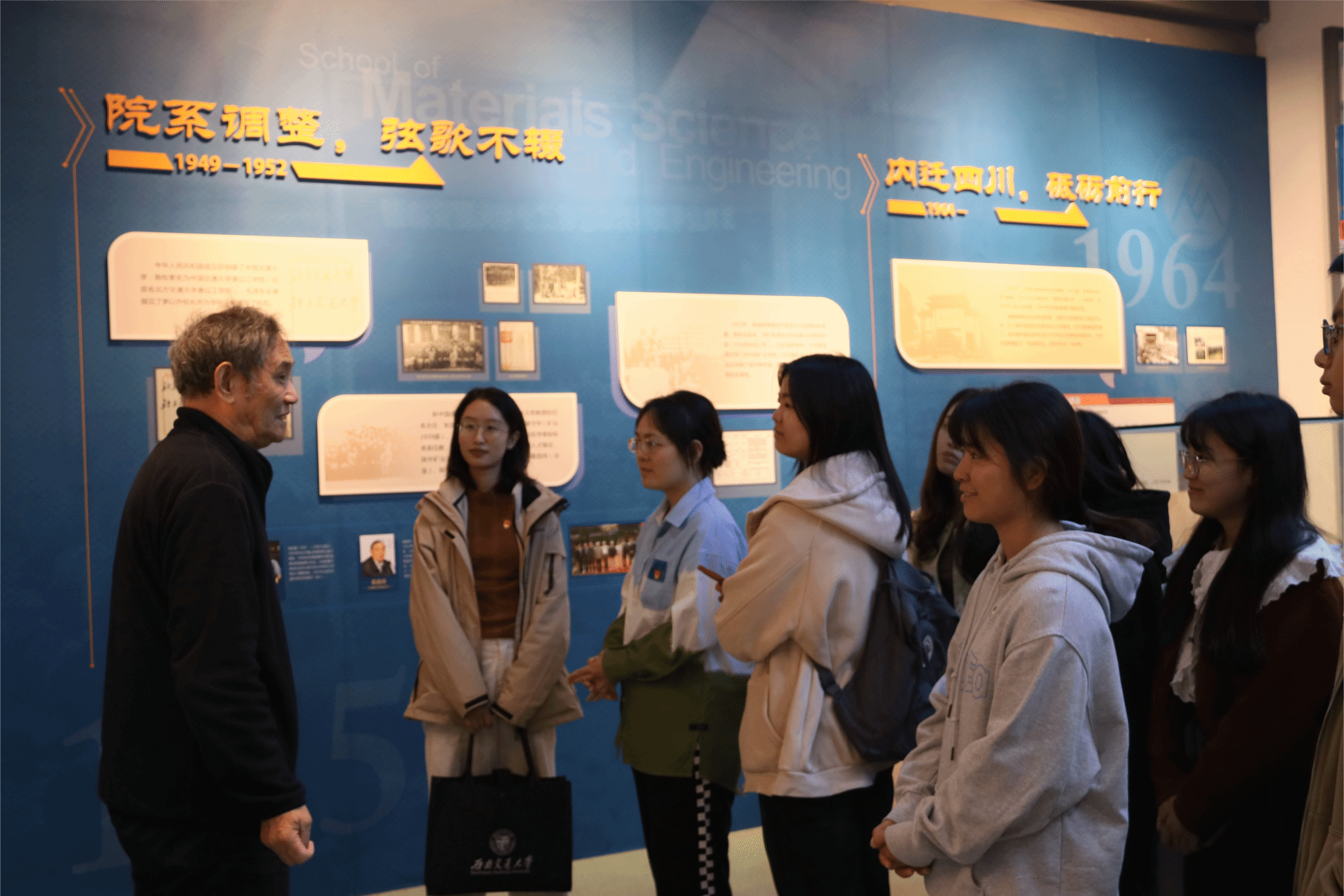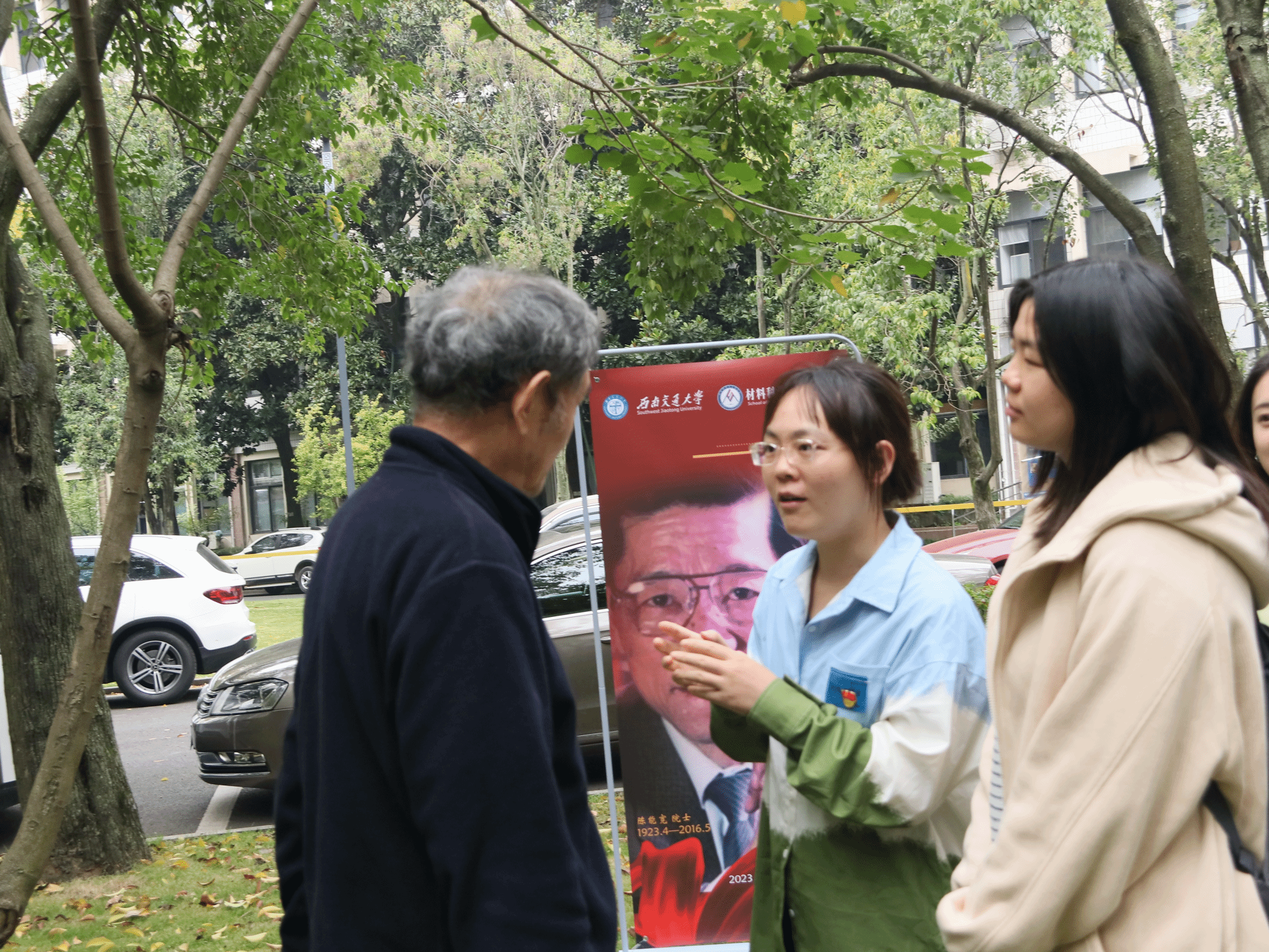 弘扬科学家精神,勇担时代使命。11月8日,在陈能宽雕塑前开展座谈会,特别邀请了校史专家、2021年度“最美交大人”梁锦唐老师主讲。梁老师从他与陈能宽先生一次难得的见面讲起,介绍了陈能宽先生的生平事迹,期间梁老师多次谈及陈能宽先生的家国情怀及无私奉献精神,勉励同学们学习优秀前辈的事迹与精神,成为甘于奉献、热于科研、忠于祖国的新时代交大人。座谈会结束后,大家一同前往院史馆思源厅,展厅记载学院各个时期的发展历程,展示了一代代材料人的奋斗与拼搏,增强新生党员对于学院的归属感与认同感,讲述了杰出校友陈能宽院士等科学家艰苦奋斗、求真学问、爱国爱校的精神,激励同学们坚持追求真理、厚植爱国情怀、增强使命担当,以更加饱满的热情投身于科研报国。