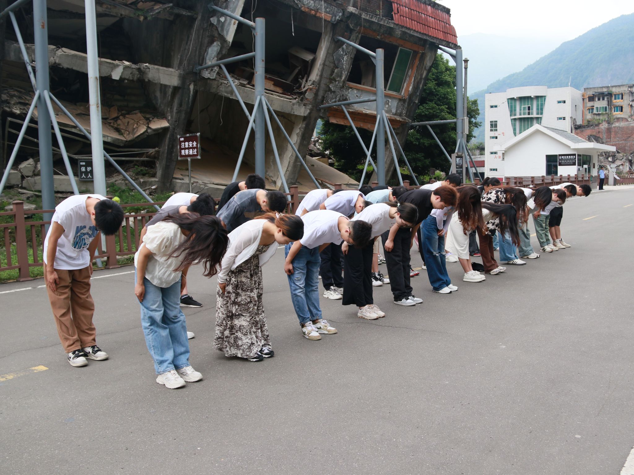 下午13点,师生党员前往北川老县城地震遗址,切身感受自然灾难的恐怖破坏力,并沉痛悼念在“5.12”汶川特大地震中的遇难同胞。跟随讲解员的脚步,同志们看着崎岖不平的道路和满目疮痍的废墟,感慨于自然灾害无情的同时,对当时现场救灾的武警和人民群众更添一份钦佩,对伟大的抗震救灾精神更多一份领悟。