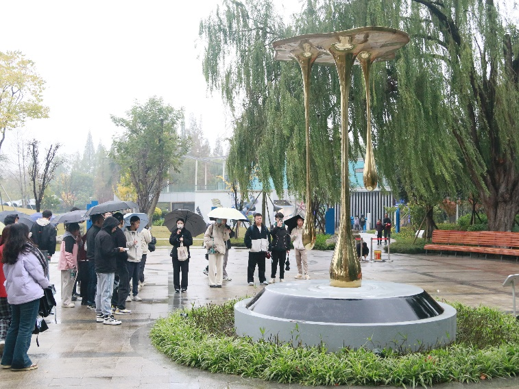 站在“三滴油”雕塑旁,讲解员绘声绘色地讲述道,在歼-10 首飞的前一夜,航空工业成飞试飞站的机械员在对飞机进行检查时,发现了极其不易察觉的三滴漏油,他立即向上级报告,紧急叫停了第二天的歼-10首飞仪式,并即刻组织了全部力量对飞机进行排查,最终发现是由于发动机漏油所致。首飞仪式一推迟,就推迟了半个月。而这小小的三滴漏油也彰显了航空人一丝不苟、精益求精的工匠精神。这也是这尊雕塑——“三滴油”的由来。