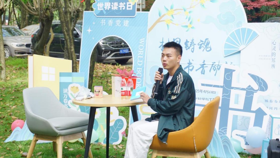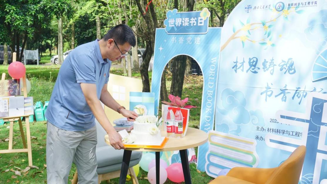 上午10点,草坪读书会如期开始。材料学院党委书记沈哲,党委专职组织员严翼飞,团委书记王誉静,研究生辅导员张宝开出席本次活动,与支部党员共沐书香。在世界读书日活动启动仪式上,学院党委书记拿起餐刀,轻轻切开象征知识与希望的精美蛋糕,为这场书香盛会拉开精彩帷幕。
