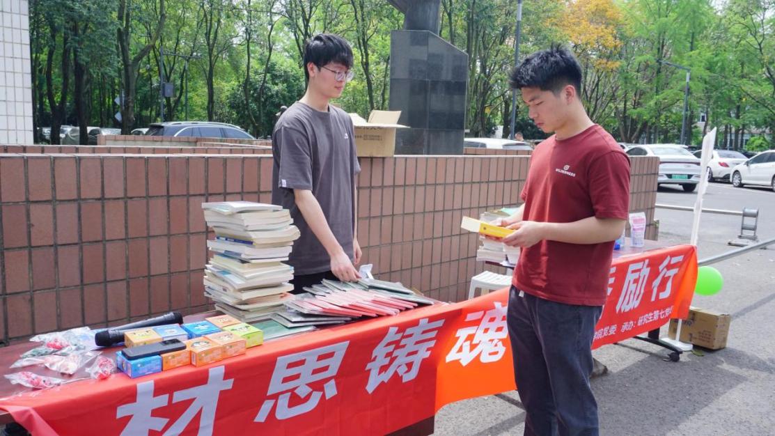 为深入贯彻落实中央八项规定精神,深化作风建设实践成果,材料学院研究生第七党支部于2025年世界读书日之际,在九里校区三号教学楼陈能宽院士纪念雕塑草坪,开展“材思铸魂·书香励行”主题党建活动。本次活动以草坪读书会和旧书回收换礼的“双线融合”形式同时开展,传承科学家精神,感受知识传递,同时将回收书籍通过公益爱心协会捐赠给贫困地区的学生,为山区学子架设知识桥梁。