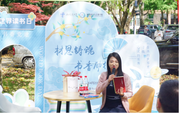研究生第七党支部于2025年世界读书日之际,在九里校区三号教学楼陈能宽院士纪念雕塑草坪,开展“材思铸魂·书香励行”主题党日活动暨开展深入贯彻中央八项规定精神学习教育知识竞答比赛。本次活动以草坪读书会、知识竞答和旧书回收换礼的"双线融合"形式同时开展。上午10点,草坪读书会如期开始。学院党委书记沈哲出席本次活动,为本次活动揭幕,并与支部党员交流心得共沐书香。