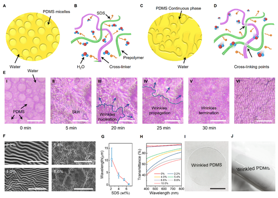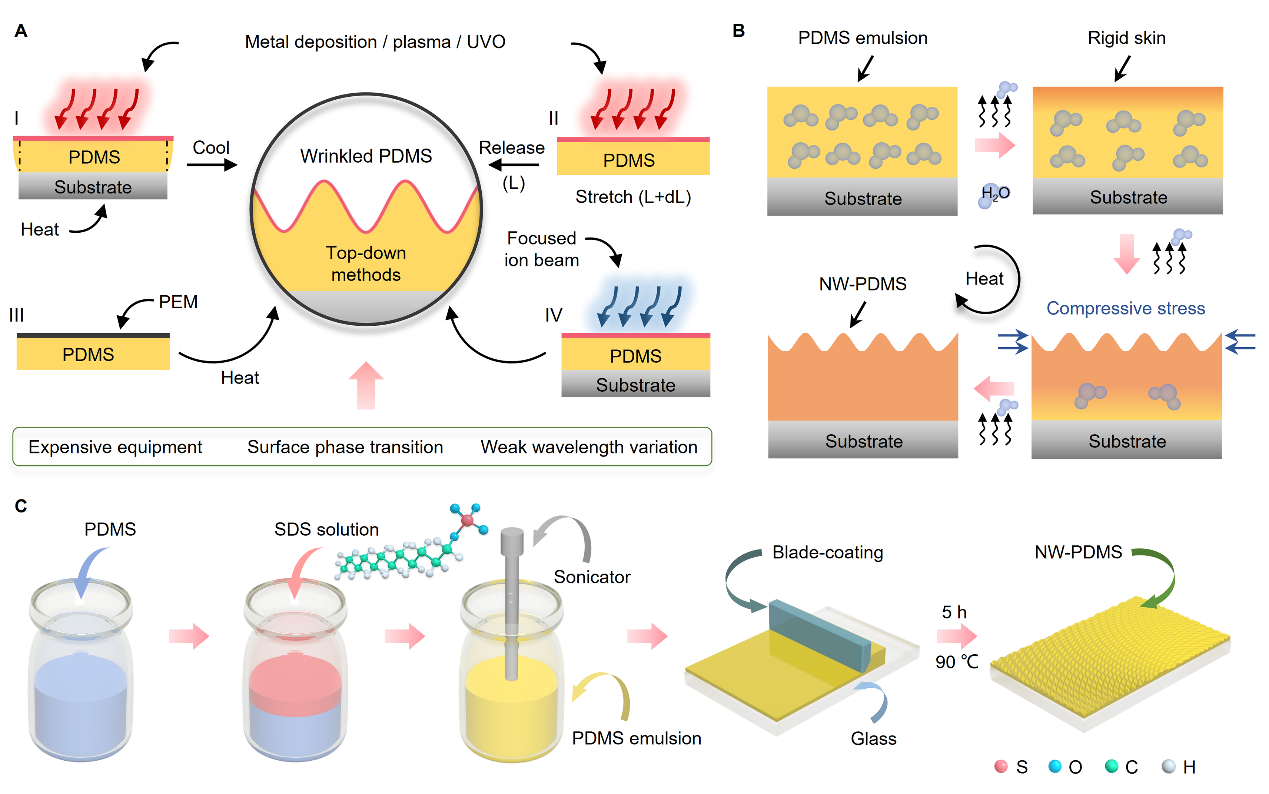 Figure 1. Synthesizing of the low-cost, large-scale wrinkled-PDMS membrane.