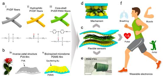 The naturally microstructure-bioinspired piezoresistive sensor for human-machine interaction and human health monitoring represents an attractive opportunity for wearable bioelectronics. However, due to the trade-off between sensitivity and linear detection range, obtaining piezoresistive sensors with both a wide pressure monitoring range and a high sensitivity is still a great challenge. Based on the research of flexible electronics (Advanced Functional Materials, 2020, 30(11), 1909603; Nano Energy, 2020, 72, 104706), theProf. Weiqing Yang, Weili Deng andYonghe Hu designed a hierarchically microstructure-bioinspired flexible piezoresistive sensor consisting of a hierarchical polyaniline/polyvinylidene fluoride nanofiber (HPPNF) film sandwiched between two interlocking electrodes with microdome structure. Ascribed to the substantially enlarged 3D deformation rates, these bioelectronics exhibit an excellent electrical performance. Furthermore, this conformally skin-adhered sensor successfully demonstrates the monitoring of human physiological signals and movement states, such as wrist pulse, throat activity, spinal posture, and gait recognition. Evidently, this hierarchically microstructure-bioinspired and amplified sensitivity piezoresistive sensor provides a promising strategy for the rapid development of next-generation wearable bioelectronics.