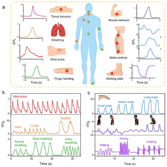 Figure 4. Monitoring of human physiological signals and motions by the developed flexible sensor.