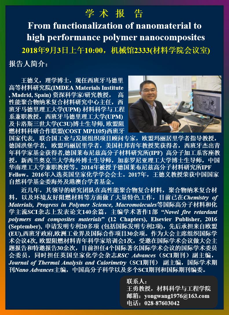 讲座时间:2018年9月3日上午10:00地点 :机械馆2333(材料学院会议...