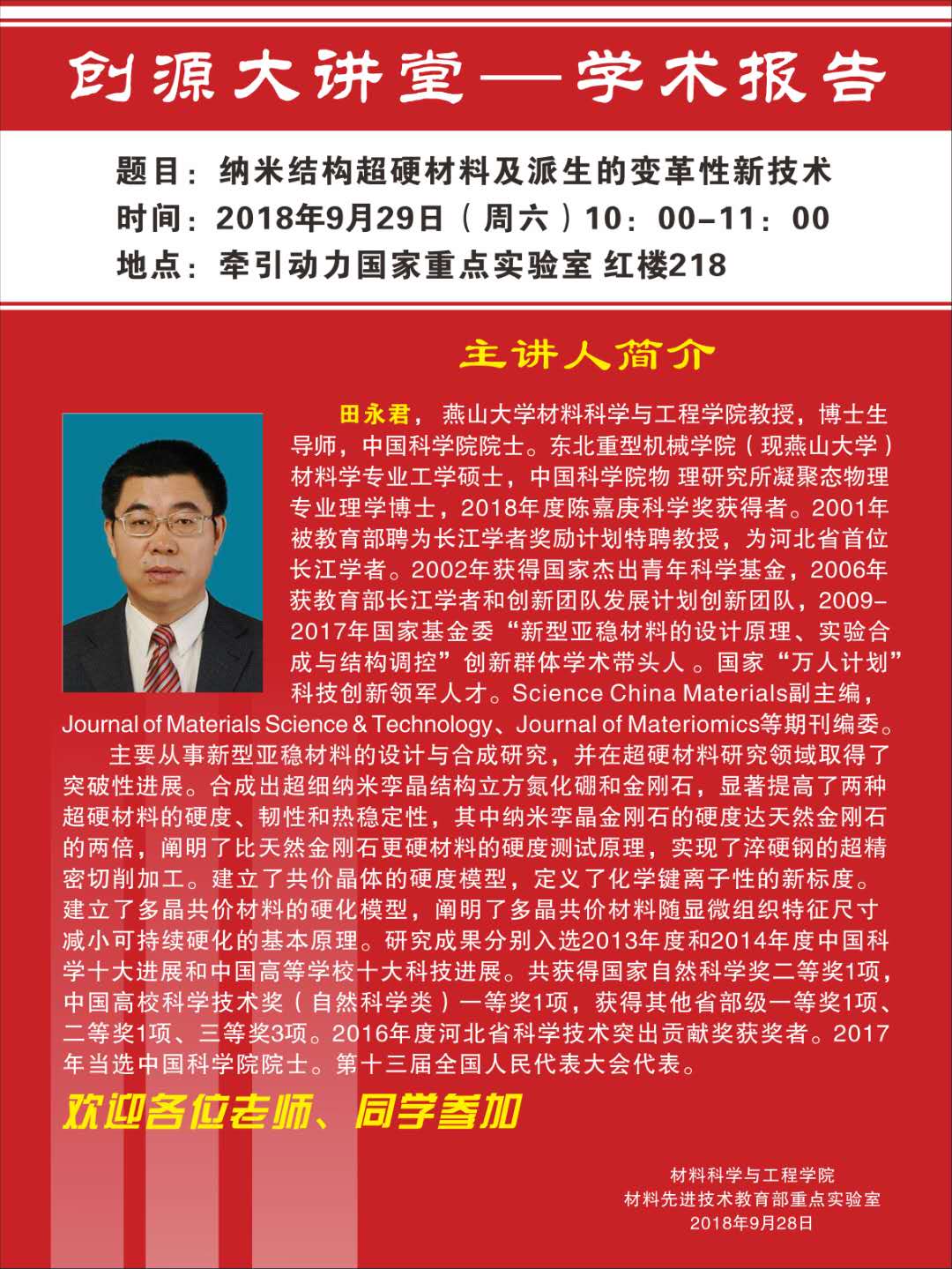 题目:报告题目:纳米结构超硬材料及派生的变革性新技术时间:2018年9月2...